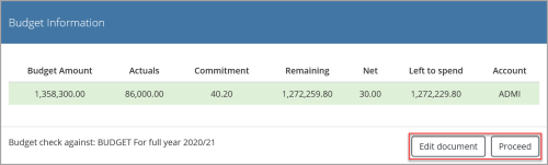 This window may look slightly different if your system has been set up to check a budget at account level. In this case, it is grouped on account code and a nominal column is not displayed. - Click Edit Document to make any amendments to the purchase order based on the budget impacts or click Proceed to post the purchase order.
