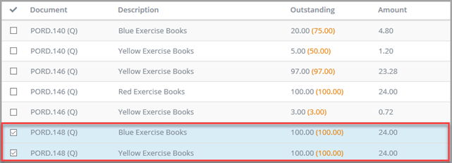 - Lines from any purchase orders for the chosen supplier will be displayed. In the previous example, there are several purchase orders for exercise books as we have produced several orders to demonstrate the various invoicing scenarios.