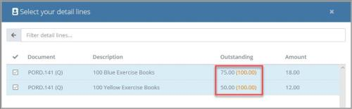 When the order arrives and you create the GRN, the items available for selection show the amended quantities, together with the original number displayed in brackets, as shown in the following graphic.