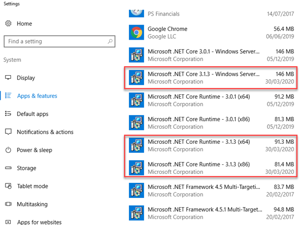 Before installing IRIS Auto Updater, you must update your SQL Server to Microsoft .NET Core 3.1.3 or later. You can check your current version by selecting Start > Apps & Features on the server.