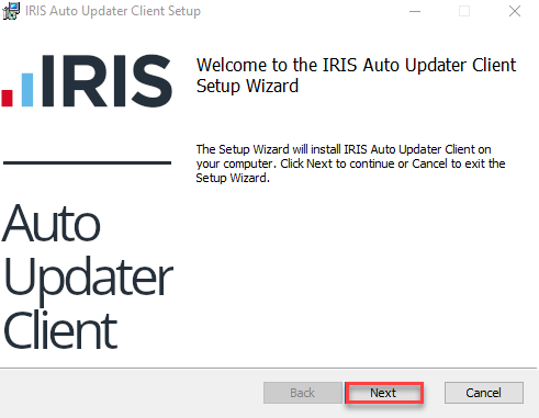 The IRIS Auto Updater Client Setup displays. Select Next.