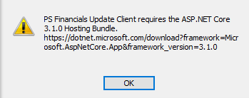 A warning message displays if you do not have the required version of Microsoft .NET hosting bundle installed. Refer to the Microsoft .NET Core section at the top of this topic for more information.