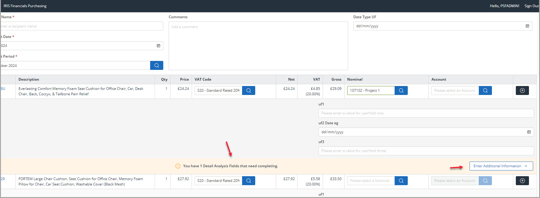 If Detail Analysis Fields (DAFs) are required for any of the item lines, a warning is displayed. To enter the information for DAFs, select Enter Additional Information.