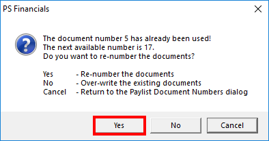 We do not recommend selecting No or Cancel. To enter different document numbers or overwrite the existing documents, document numbers must be assigned again to the payment lists they were originally for.