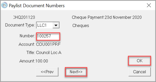 If payment cheques are filled out before document numbers are assigned to a payment list, the correct cheque number must be entered.