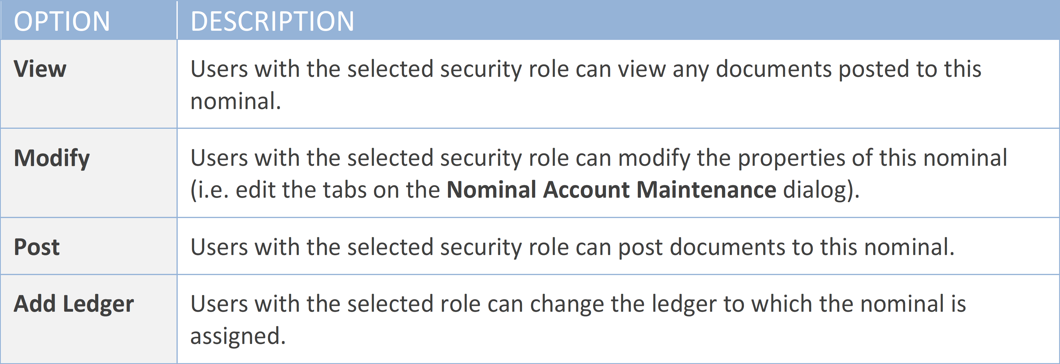 In the previous example, users who have the CEN security role assigned can view documents posted to this nominal (as well as the nominal itself), users with NOMMAIN can modify the nominal properties, users with CCMGRS can post documents to this nominal and users with LEDMAIN can link the nominal to a ledger.