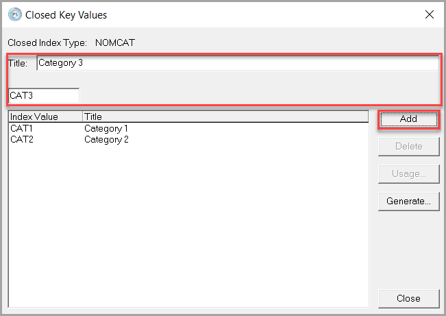 - Enter a Title and code for each value, clicking the Add button after each entry. Once all the entries have been added, click the Close button.