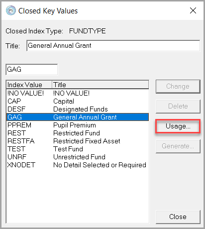 - If required, you can highlight each entry and click the Usage button to see which accounts have this index type selected. When running a report with this index type selected, these are the accounts that will be reported on.