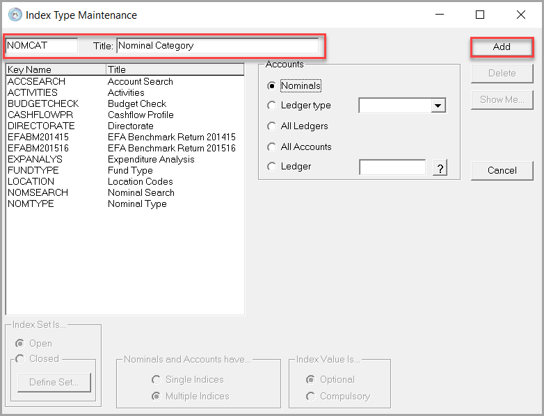 - The Accounts section enables you to determine whether to apply the index to nominals, ledger accounts of a certain type (e.g. sales purchase), all nominals and accounts or a specific ledger.