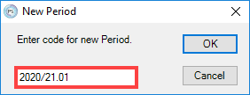 2. Enter a code for the new period in the format YYYY/YY.PP. The following example shows period 2020/21.01 being created.