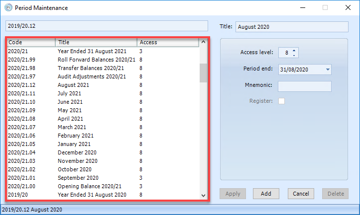 7. Once you have completed the required information, click the Apply The new period will then appear in the list as shown in the previous graphic. Continue this process until all the required accounting periods have been added.