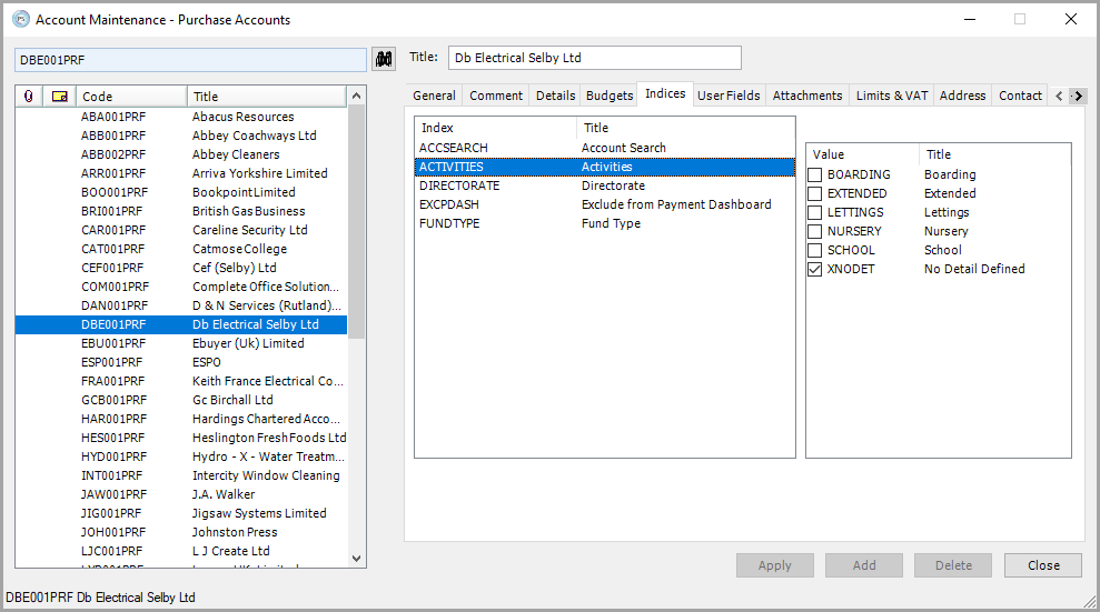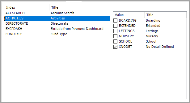 At least one index must be selected here to ensure that the account appears on the management account report. If you are not sure, select XNODET.