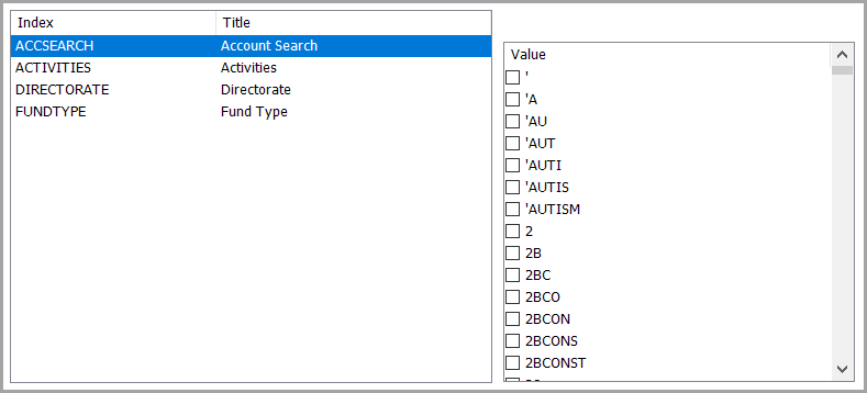 This index is used to group accounts by their source of funding – particularly useful for cost centre and capital ledger accounts.