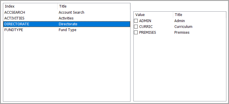 This index is used to group accounts that relate to a specific directorate, e.g. all the suppliers used for curriculum purposes.