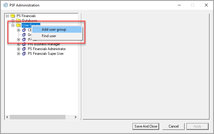 A variety of user groups will be provided on installation based on your academy/MAT's requirements. These can subsequently be amended, or additional groups added via the Financials Administrator module accessed via PS Accounting. Wherever possible, it is simpler to either Editing an Existing User Group or copy a similar user group, then edit as required.