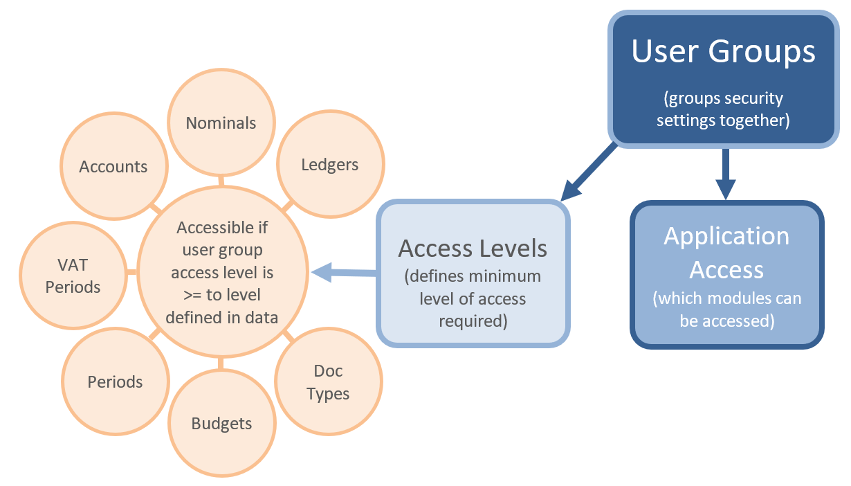 You may then want to restrict access to certain data functions (e.g. view, modify, post, etc.). For example, you may want only certain users to be able to modify existing suppliers or create new suppliers accounts in the PURCHASE ledger. This is achieved using security roles. For more details on security roles, see Overview of Security Roles
