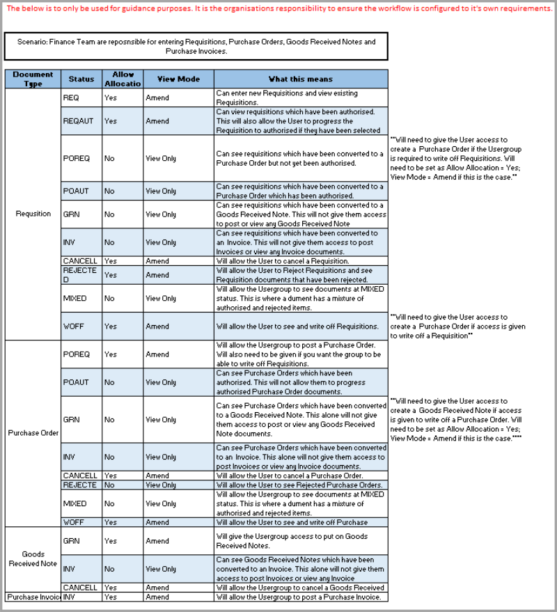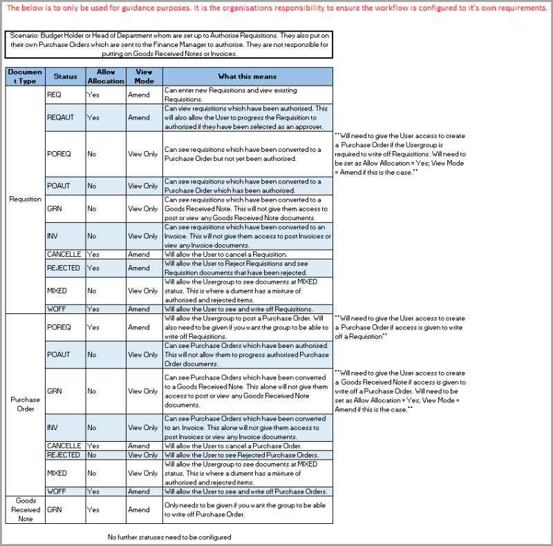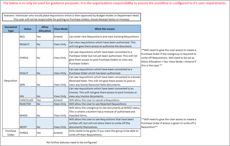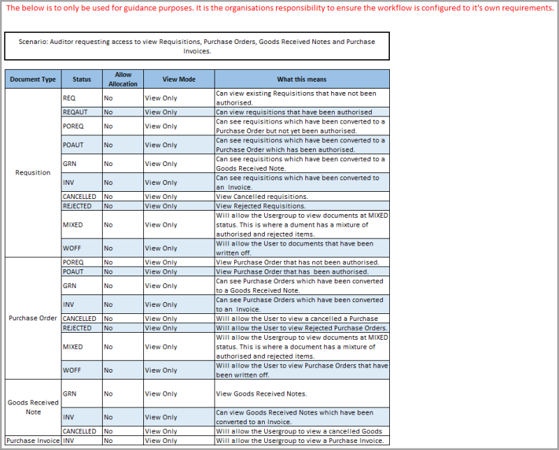 Each type of document is allocated a status to identify to which stage of the purchasing process the document relates. For example, a status of POREQ is allocated to a purchase order and a status of POAUTH is given to a purchase order that has been authorised.