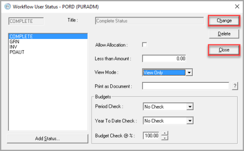 When you have selected the required options for the document type, click Change to confirm and save your selections. When you have selected the options for all required document types, click Close to return to the Document Workflow dialog.