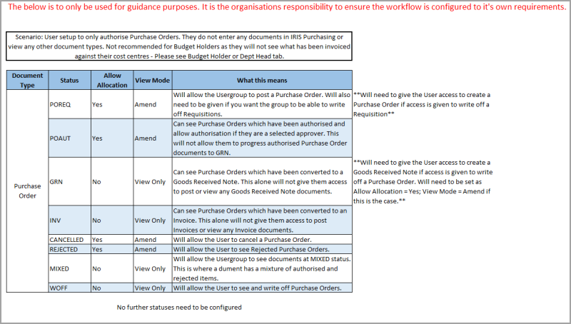 OPTION DESCRIPTION Allow Allocation Select to enable the user to create the specific document status, e.g. create a requisition, purchase order, etc. Less Than Amount Select if you want to limit access based on an order value. For example, you could enter 1000.00 to limit access to orders up to 999.99. If you do not want to limit access leave the value at 0. View Mode Select an option from the drop-down list to determine user group access. The options available are: No Access - the user group are unable to view the document. View Only - the user group can view but are unable to amend the document. Amend - the user group is able to amend the document. Print as Document You do not need to select this as it is not available in IRIS Purchasing Period Check Select an option from the drop-down list to determine if the budget period is checked against the current period spend. The options available are: