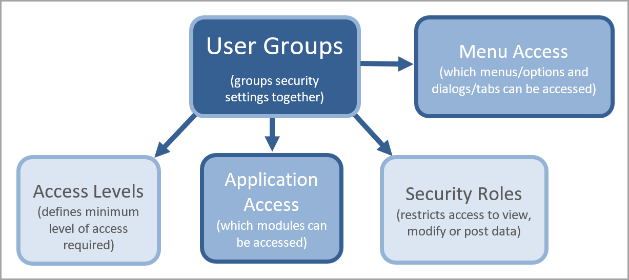 The order in which security is applied is flexible, because most of the security settings work in conjunction with each other. However, you must give applicable access to the required menus and dialogs for each user group to enable access to specific functionality.