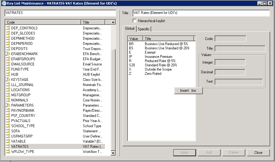 - Click on VATRATES which will display the current VAT rates in your system on the right-hand side of the Key List Maintenance window.