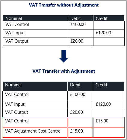 A VAT adjustment transfers the adjustment amount from the VAT control to the nominated cost centre account as shown in the following graphic.