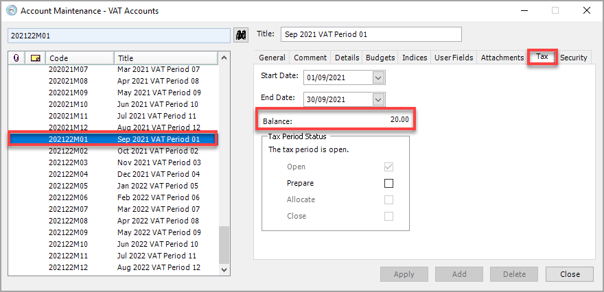 You may need to move VAT transactions to a different VAT period if a future VAT period has been opened in error. In the following example, it has been identified that VAT Account 202122M01 (September 2021) has been opened instead of 202021M01 (September 2020).