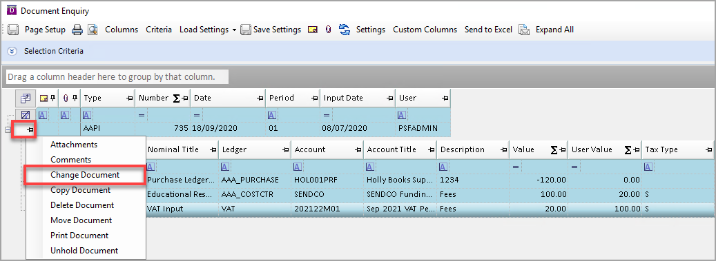 - The Document Enquiry window is displayed. Right-Click on the grey box to the left of the document header and select Change Document from the pop-up menu.