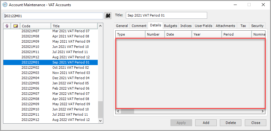 - Highlight the applicable VAT Account and select the Details tab.