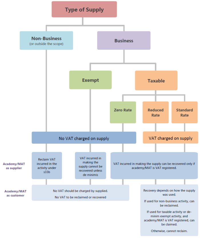 As for non-registered academies/MATs, VAT on costs incurred in order to educate the pupils (non-business activities) can be reclaimed. VAT costs incurred in relation to the provision of taxable business supplies - whether VAT is charged at the standard or zero rate - can also be reclaimed.