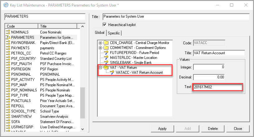 - In IRIS Financials go to Masters > Keylist and select PARAMETERS.
