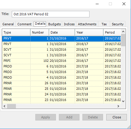 This will allocate the VAT Transfer documents with the individual documents making up the VAT return. Click on the Details tab and all lines should be allocated (cream in colour) as shown in the following graphic.