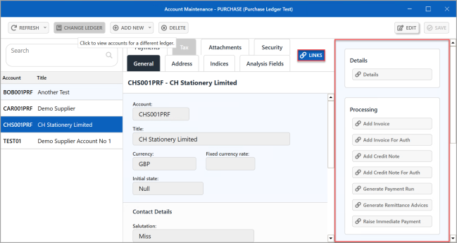 LINKS panels are available in various areas of IRIS Financials, containing one or more additional functions related to the account type you are viewing. For example, when looking at a supplier account, the LINKS menu offers options to add an invoice, add a credit note, generate a payment run, and so on.