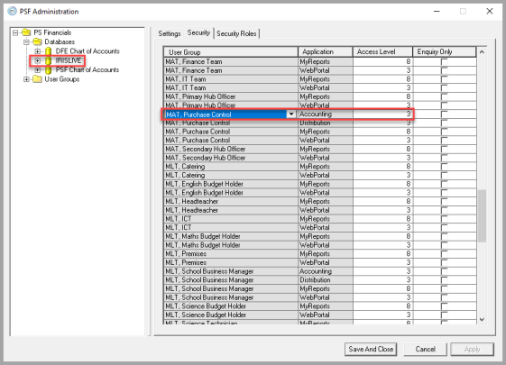 Any users who are members of the Purchase Control user group have level 3 access enabling them to view and maintain IIRIS Financials data.