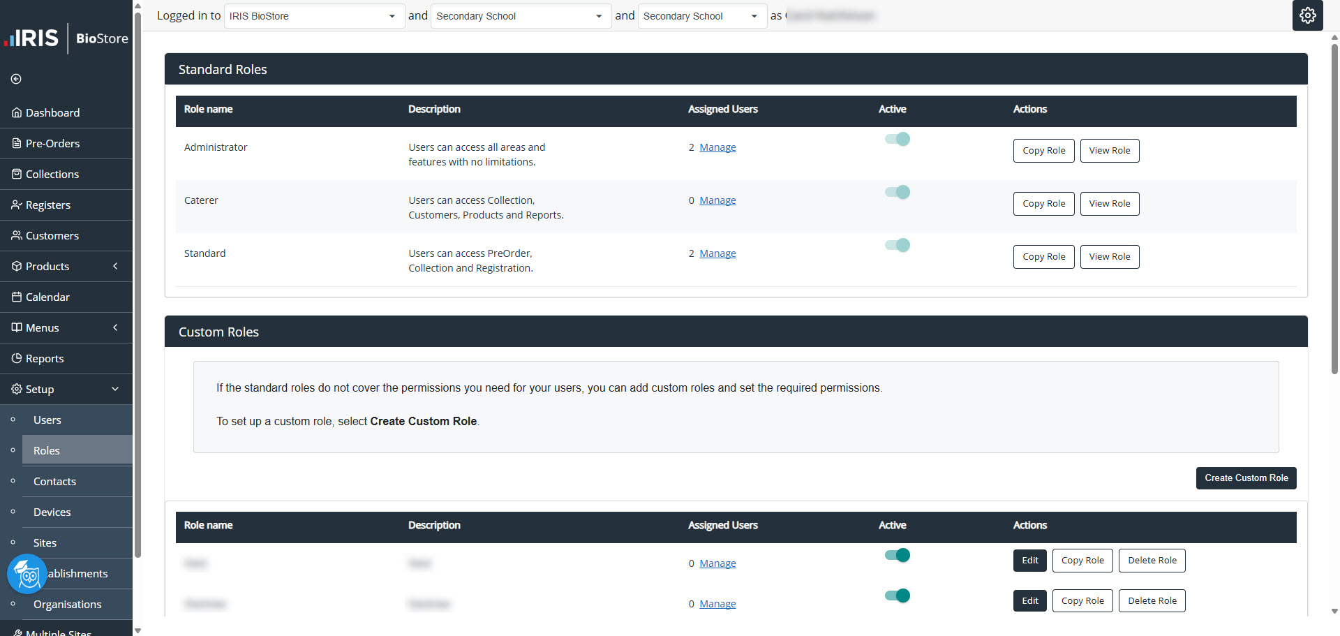 - All roles you have already set up are available in the Custom Roles section.