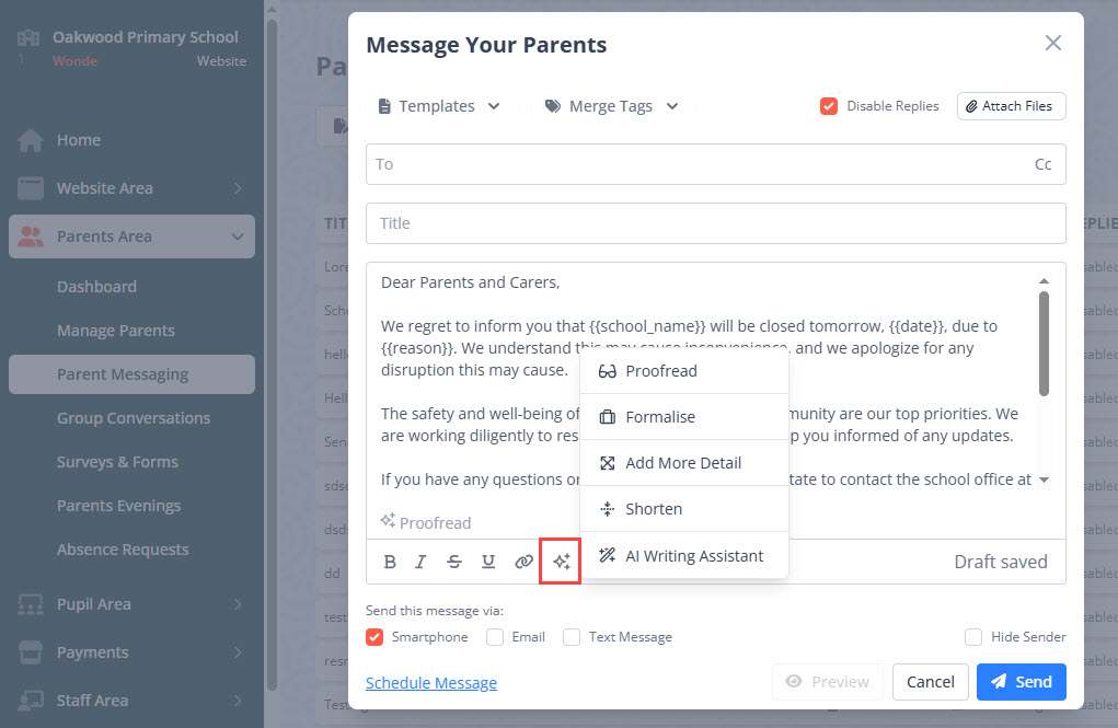 Use the AI Writing Assistant to Proofread and Improve Messages