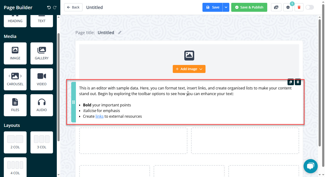5. Websites are displayed as one column, to display the page with more than one column, from Page Builder, select a Layouts option and drag it onto the page.