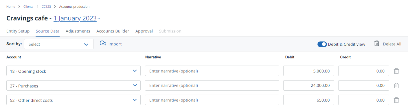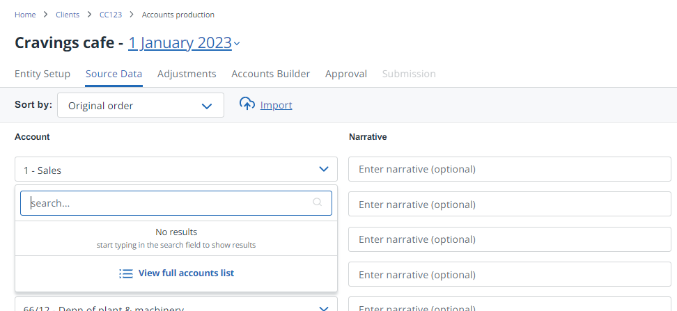 When manually completing or editing trial balance data on the Source data tab, you can either manually enter codes (if you can remember them) or select them from an account code list. The list is based on the chart of accounts you selected for this client when the accounts were first created.