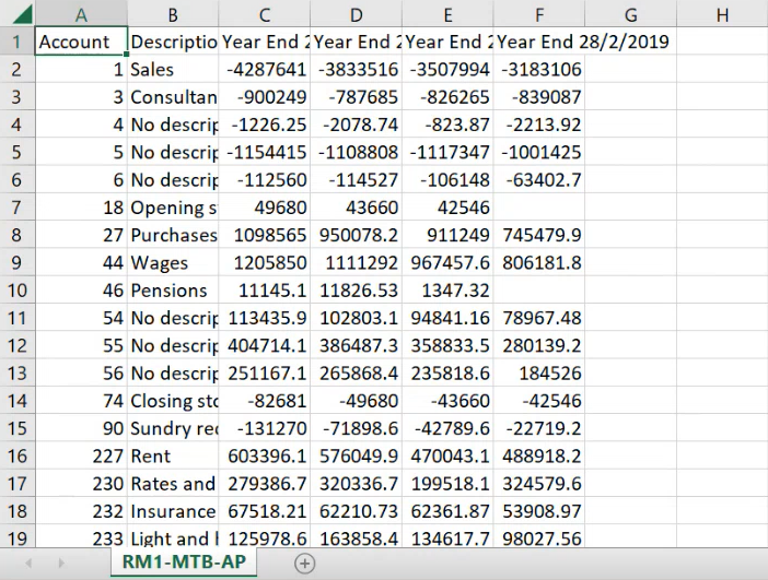 The file will launch and look similar to the following. The format consists of an Account and Description column followed by each year in descending order (newest to oldest).
