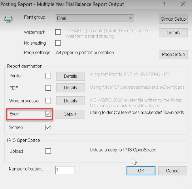 On Excel Output Details, confirm or edit the Folder and File name, then select OK to produce the CSV file.