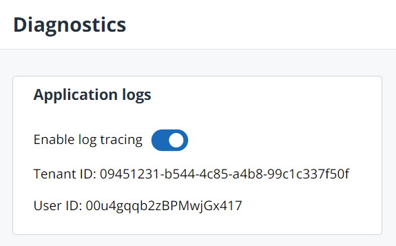 Our support diagnostics tool lets our support team trace your current user session. It also contains your User ID and Tenant ID.