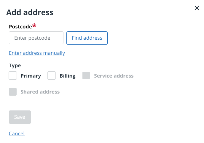 - In the Postcode box, enter a valid postal code and select Find address. If the required address is not found, you can enter the address manually.