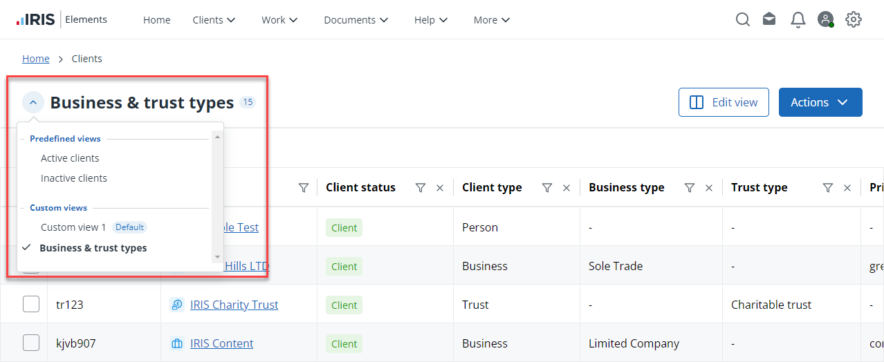 If you haven't saved any custom views yet, only the predefined views of Active Clients and Inactive Clients are available.
