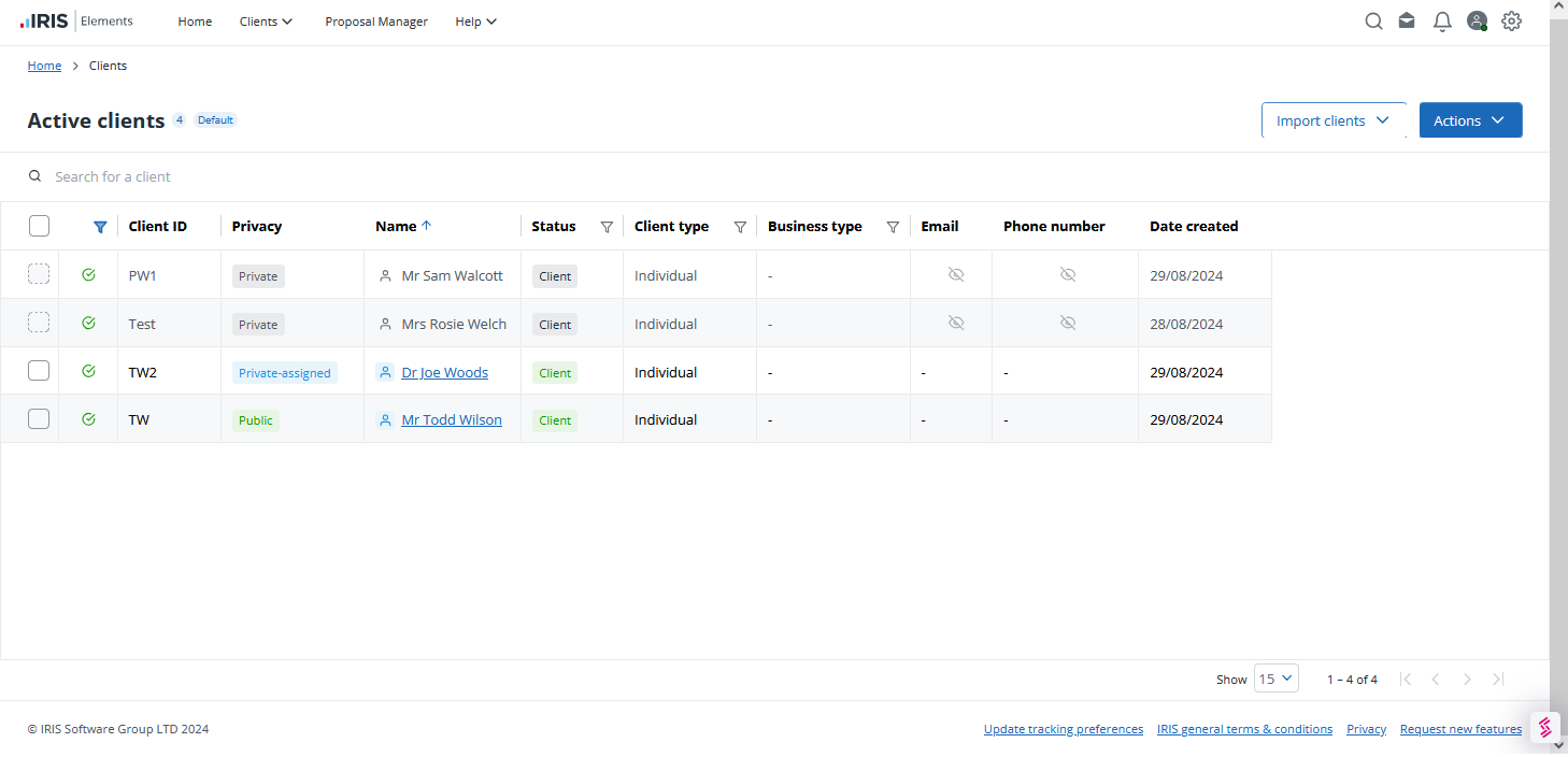 Client privacy can be added to client records. Where a client record has been made private and the logged in user does not have access to the record, the Email and Phone number of the client is hidden from view.