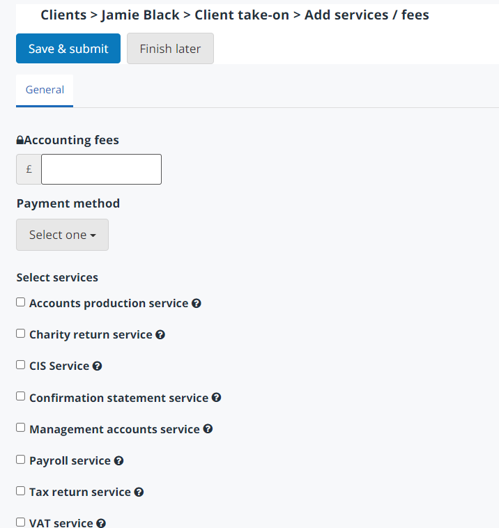 Once a client has been added to IRIS Elements and you have recorded practice management details, a client take-on form is automatically created. This form enables you to choose the services you want to provide to the client. You can also choose these services via the Services tab.