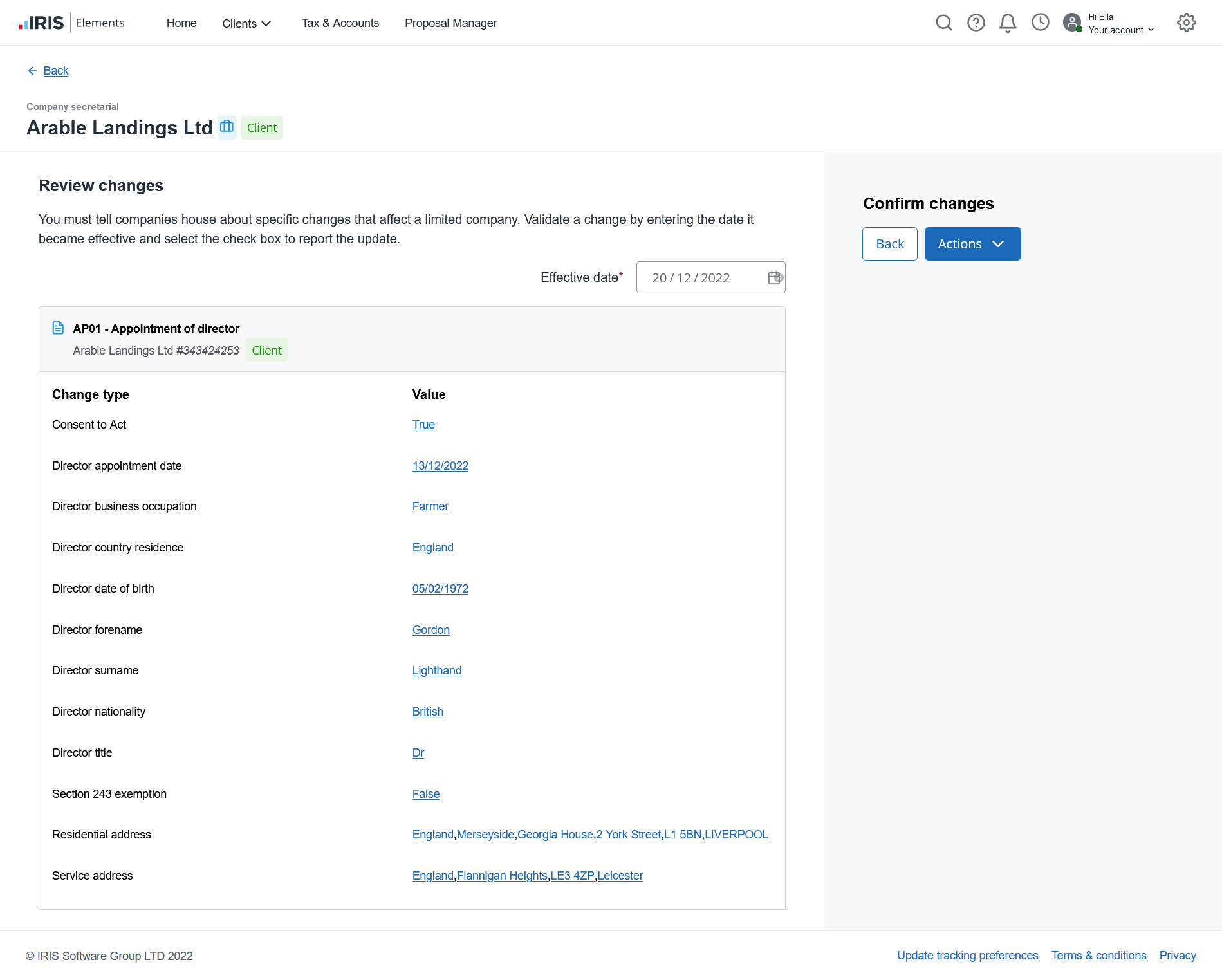 Forms that deal with data changes, such as the CH01 (Change of director's details) display the changes that have been made to the client's data in a From and To format, and the mandatory information required to submit the form, e.g. the client's date of birth.