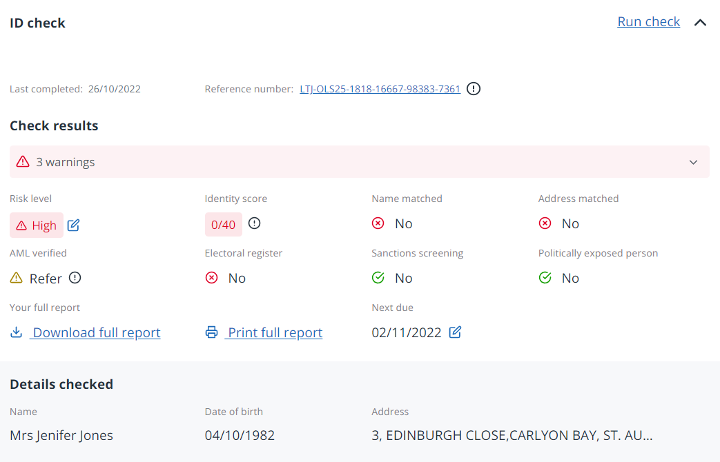 - Once the check has been completed, a summary of the results and a risk level is shown. You can Download full report or Print full report. You can manually edit the Risk level and Next due date.