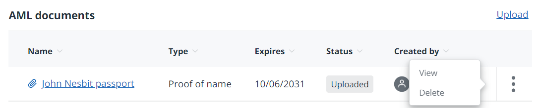 10. You can add further documents by selecting Upload, or select the more options (3 dots) icon to View the document details or Delete the document.