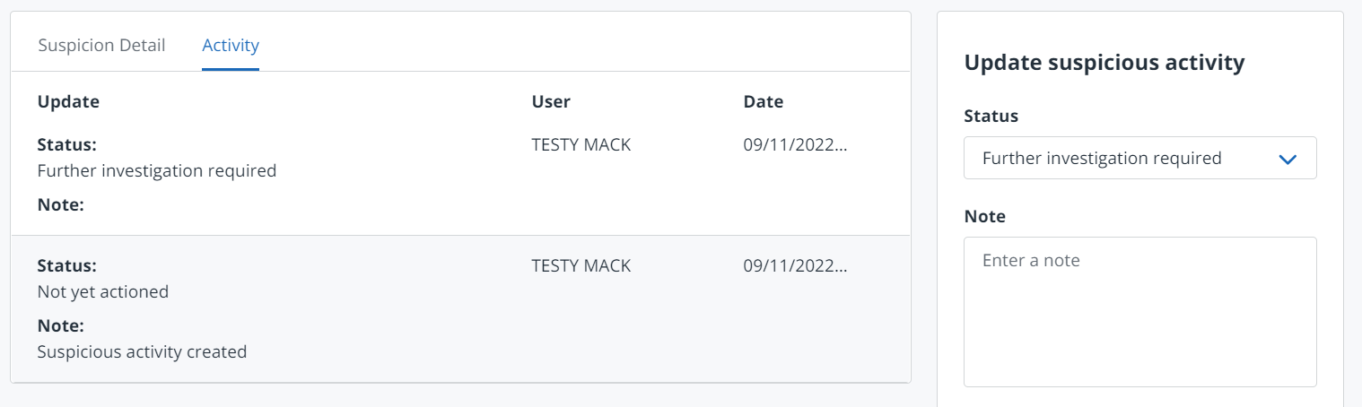 - The Activity tab shows an audit trail of all actions relating to the suspicious activity and the person who raised the report.