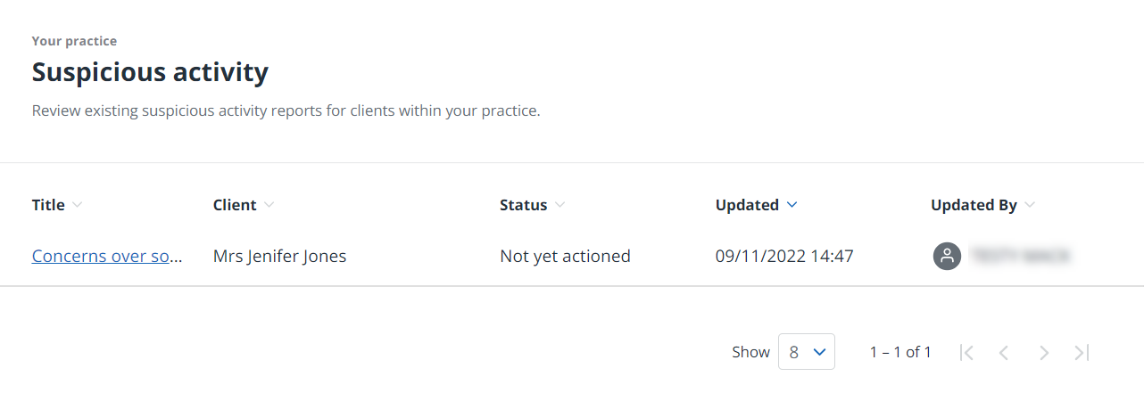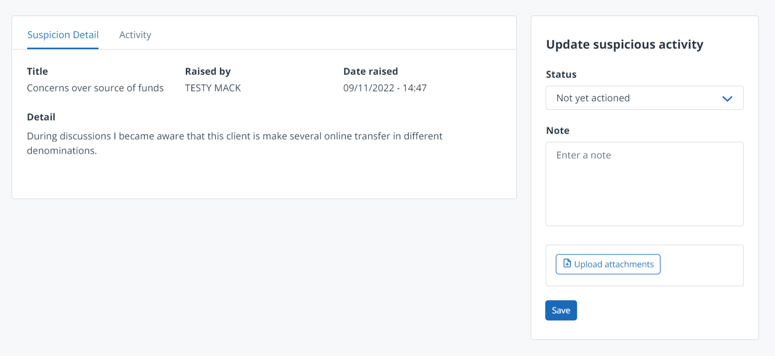 - In the Update suspicious activity panel, select the Status of the report together with any notes to validate the status update. You can also Upload attachments. Select Save. The update is then added to the Activity tab.